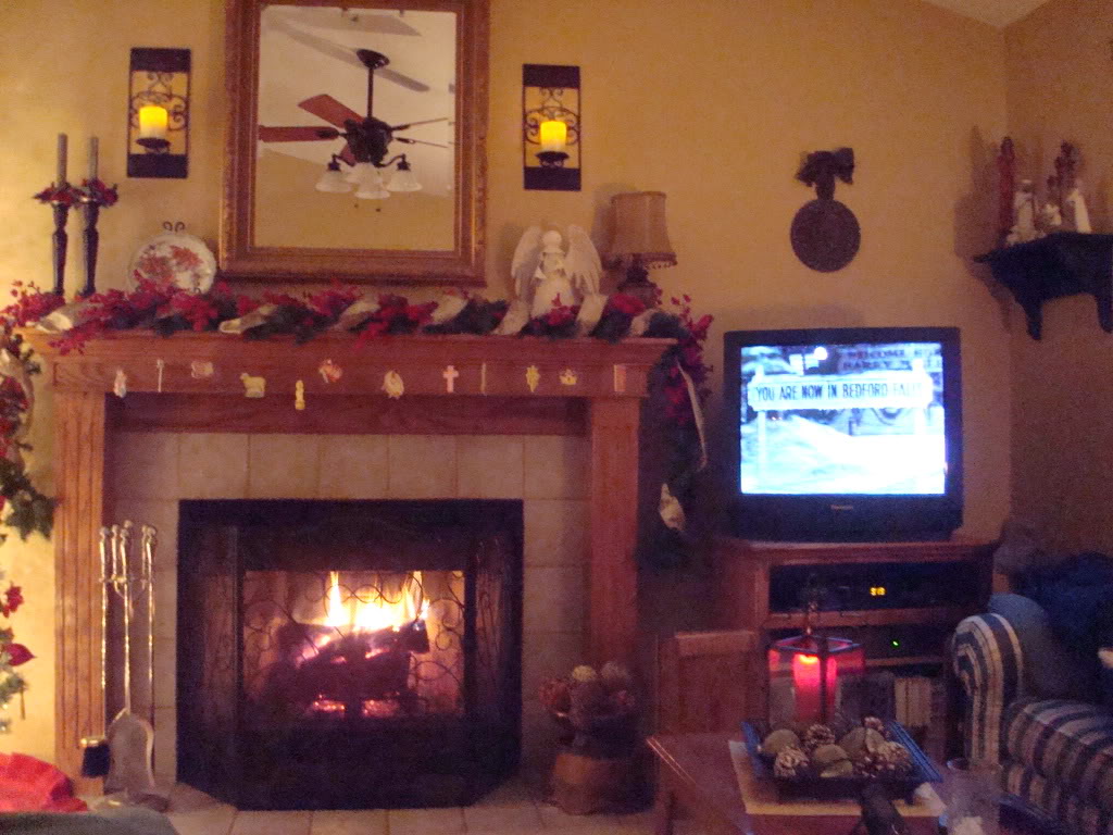 The scene: We’ve had an early Christmas Dinner (which I enjoyed working on a good part of the day) — we’ve been to our Candlelight Christmas Eve Service, which I love, to celebrate the Savior’s birth (ours is at 6pm) — we’ve come home, gotten “comfy” and had pumpkin pie with real whipped cream and coffee — the Christmas tree, fireplace & candles are all aglow — we’ve popped in our tradional Christmas Eve movie (if you can’t read the television it says “You Are Now in Bedford Falls” – It’s a Wonderful Life – l♥ve Jimmie Stewart and George & Mary Bailey!)