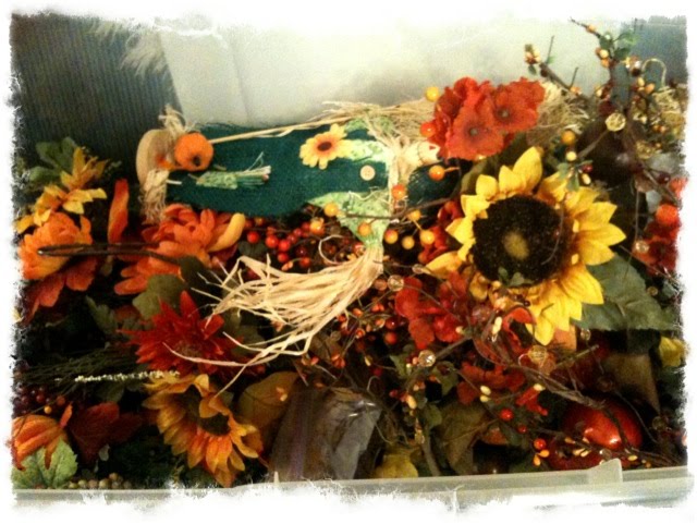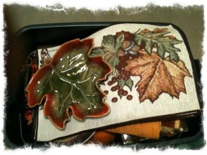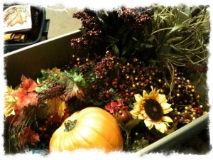 I have starting taking a look at my “stash” to see what I want to use and what needs to be retired. So far one wreath has been stripped of it’s re-usables and thrown out. Thinking a few more items may join it – the scarecrows were cute, but as dear hubby said when we got rid of the too-cutesy wreath, “It’s time to look like grownups”. Their smiling faces can find a new family at the Goodwill 🙂